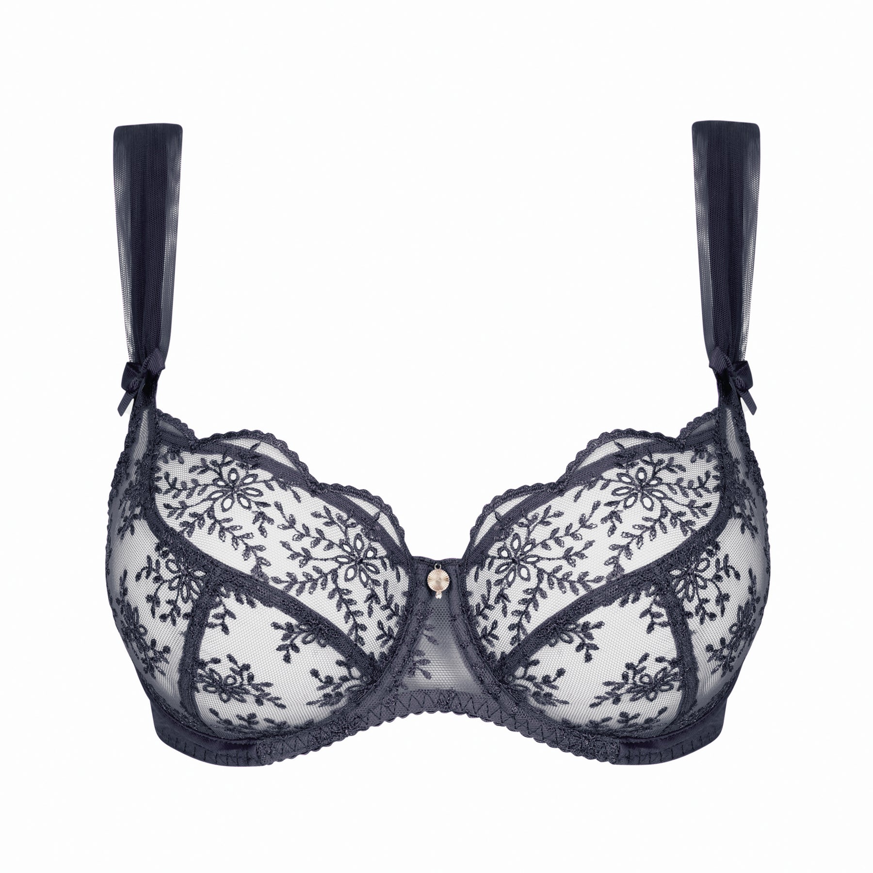 The demi-cup shape is the most romantic piece in the Charlotte line. The open neckline is enhanced by a delicate scalloped edge, highlighting the rich floral pattern. The embroidered tulle cups play with transparency while ensuring support and comfort, for a naturally flattering look. The straps are covered with delicately pleated tulle, for a romantic, feminine touch.