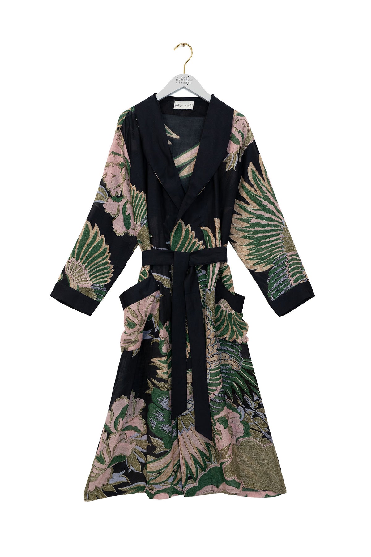 The lightweight design falls to an elegant long length and features a fold-over collar, complete with a self-tie waist belt and front patch pockets.